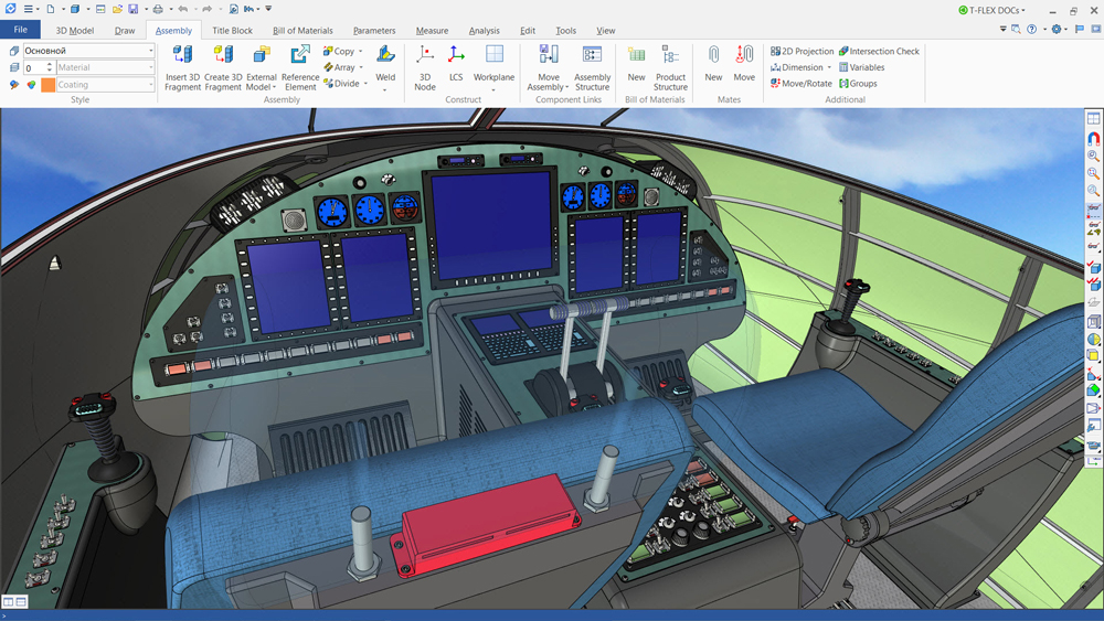 By the way, we show the aircraft cockpit in virtual reality directly in the T-FLEX CAD without any additional preparations and simplifications. This is achieved by using the T-FLEX VR application, which allows not only viewing and navigating the model, but also take measurements, evaluate the ergonomics, manage visual parameters of assembly fragments and edit certain components.