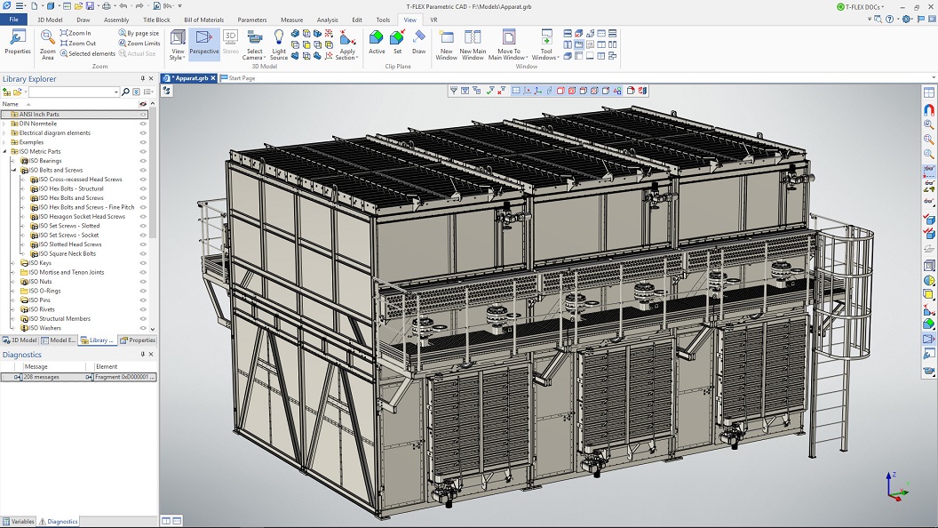 This block of devices was developed at Gribanovskiy Machine-Building Plant, and is currently in production. The block of air coolers consists of three units and service platforms. The structure of the apparatus consists of a section unit, a fan unit and product inlet/outlet manifolds. The section block includes a heat exchange bundle assembled from finned pipes, distribution chambers and upper louvers. Heat exchange pipes in the distribution chambers are fastened by welding with flaring, fastening type C1R4-1 in accordance with GOST R 55601-2013. Distribution chambers are welded. The front chamber has a product inlet fitting, a rear product outlet fitting. The fan block includes a metal structure, a fan drive, a fan manifold, a fan wheel, blinds. The fan impeller rotates in the collector cavity. The device has a vibration-resistant structure. The project became the winner in the category The largest assembly (more than 50 thousand bodies) in the competition "T-FLEX CAD: I am an engineer!"