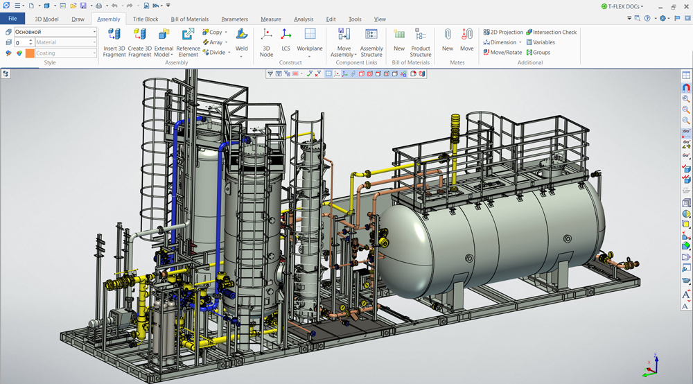 Results of 3D modeling and engineering projects competition "CAD Competence 2021" have already been summed up. Undoubtedly, a most memorable project that won the "Expert" nomination was an assembly model of a carbon-vacuum adsorption vapor recovery unit of the UUVA-02-D type (Fig.1,2). Containing more than 18,000 bodies, the model is characterized by a high degree of detail, and based on it, a real operating unit was created and mounted. The project is fully built in T-FLEX CAD using key features of the system. For this reason, we asked the author of the project, Alexander Sergeevich Medvedev, a design engineer at BorMash LLC, to tell us in more detail about operation of the unit, as well as about the assembly design process in T-FLEX CAD.