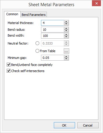The command brings up the dialog box “Sheet Metal Defaults”. Default parameter values entered in its input boxes affect all sheet metal operations on the given 3D model:
