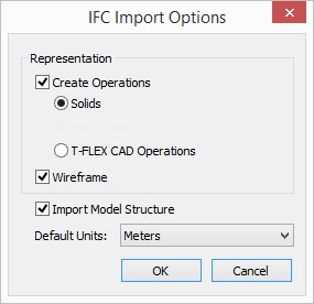 The geometry from the file of IFC format can be imported as: Solids and T-FLEX CAD Operations. When you select T-FLEX CAD Operations the system tries to create T-FLEX CAD operations and the import will be slower.