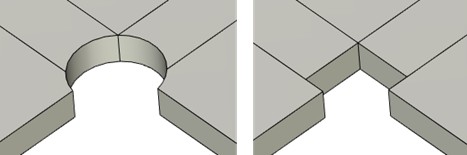The radius of the circular hole is equal to the radius specified in the parameters. The square hole is constructed by three or more points of intersection of the given radius circle with the planes selected for the operation.