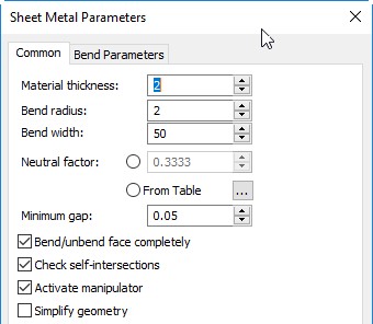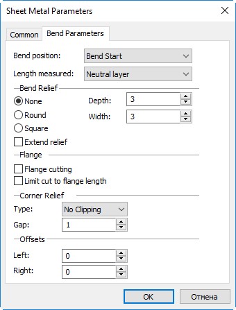 The main operation of working with sheet metal is bending. Many operations create geometry, which is the result of several bends in different ways or operations close to bending, but having their own characteristics. Accordingly, the dialogs of commands for working with sheet metal contain bending parameters that are the same for many operations.