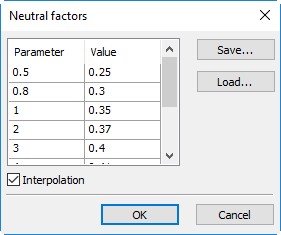 . Upon pressing the button, an additional window Neutral factors opens. This window displays the Neutral factor table of the current document. It represents a tabulated dependency of Neutral factor (the column “Value”) on the ratio “bend radius/workpiece thickness” (the column “Parameter”). The Interpolation flag sets the type of table data interpolation: the set flag means linear interpolation – the Neutral factor linearly interpolated between the tabulated data; the cleared flag means piecewise constant interpolation – the Neutral factor is maintained constant until reaching the next entry.