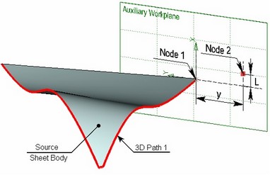 An auxiliary workplane is constructed in order to get the source 3D node, which is perpendicular to the 3D path 1 and is passing through one of the vertices of the source sheet body. The necessary 2D constructions are created on the workplane. The sought 3D node is created based on a 2D node on the workplane – the Node 2. Node 2 was constructed as follows: first, the Node 1 was created on the workplane with the coordinates (0,0) (corresponding to the vertex of the source sheet body through which the workplane passes). A horizontal line is drawn through this node. A vertical line is drawn at the distance "y" from Node 1, perpendicular to the horizontal line. Node 2 lies on this line at the distance "L" from the lines intersection point. The value of the "L" variable is defined in such a way as to vary with the changes in the copy counter of the 3D path. Therefore, as the 3D path creation progresses, the position of the 2D Node 2 changes by the sinusoidal law with the current copy number, and so does the based on it 3D node.