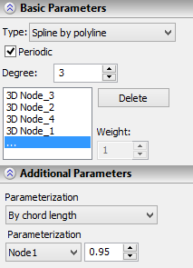 ● 3D spline by polyline (a NURBS – non-uniform rational B-spline) – an arbitrary-degree spline by a control polyline. The control points are used for building the control polyline The spline itself does not pass through them (except the first and the last point in the case of an open spline). The spline's parameters allow specifying the degree, weights at control points, parameterization type and positions of the parameterization nodes.