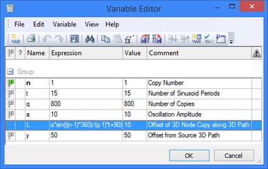 At this point, the parametric 3D path can be constructed. We need to define two parameters in the parameters dialog: enter the number of copies and assign the variable to act as the copy counter. In the given example, the "Copy number" parameter is assigned the variable "s".