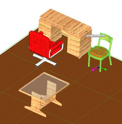 Let us invoke the «Transformations» command via the context or text menu. We select the chair, object (1) for transformation. After that on the dragger we select the X-axis along which the translation will be carried out. Next, with the help of the cursor on the object (2) we select the midpoint of the edge to which the X-coordinate of the chair being moved will be «snapped». When pressing