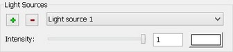 The group of parameters in the lower-left corner of the dialog window is provided to manage light sources attached to the active camera in the 3D scene. This group includes the list of dynamic light sources existing in the current 3D window, buttons for adding/deleting light sources attached to the camera, as well as control elements for defining parameters of each of the light sources.