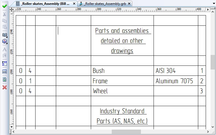 Call the command BC: Create Report/Bill of Materials. In the coming up dialog box set parameter On New Page and select a prototype (for example, “ISO_BOM.grb”). Press [OK]. As a result, a new page will be created in the document, displaying the BOM being created in editing mode (subsequent BOM pages are also created automatically).