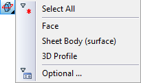 When using one of those options for selecting the parting body, the selector is tuned up accordingly. For example, in the sheet body selection mode, the following parting objects can be selected: a face, a 3D profile, an operation-surface. Moreover, filters for choosing the objects can be also customized with the help of the drop-down list of the option In the solid body selection mode, only objects with solid geometry can be selected for parting. |
