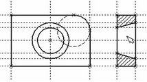 After that, we will create the lines belonging to the conical hole, on the left view. Move the cursor to the right-hand-side segment of the left view, and then move it along that segment up until establishing the relation between the line underlying that segment and the greater circle. Click