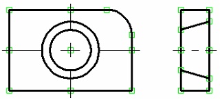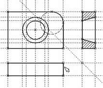 Next, we need to create the image of the conical hole on the side view. Without quitting the current command, move the cursor to the right-side segment of the side view, and move along the segment until it snaps to horizontal tangency against the top of the bigger circle.