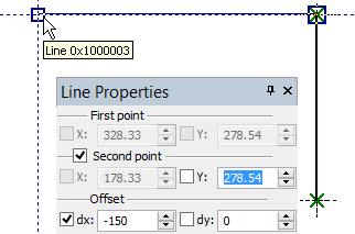 For the second node of the segment, define the Y-axis offset (100) in the properties window. The cursor will start moving along a horizontal auxiliary line. Move it to the vertical construction line going through the first segment node. When the snap to the latter line engages ("Line …"), click