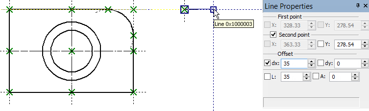 Thus, we have created the top segment of the plan view. A new auxiliary line starts rubberbanding after the cursor, parallel to the newly created graphic segment, as indicated by highlighting. Move the cursor down, and set the desired distance, equal to 35, in the property window, thus defining the thickness of the plate. This will fix the auxiliary line with respect to the reference segment. Slide the cursor along the line, locating as shown on the diagram.
