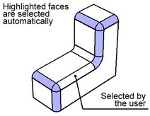 Moreover, sometimes it is necessary to delete all blended faces adjacent to some flat face. Of course, you could select such faces manually; however, more convenient is to select just the flat face. This lets the system automatically select the blend faces to delete. Such automatic selection of faces insures the model parametric behavior through changes in the number of blend faces, maintained by the system.