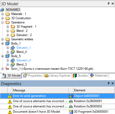 This tool window is used for displaying warning and error messages. The errors may occur due to invalid operation parameters input, an out-of-range variable value, regeneration with incompatible parameters, etc. The system attempts to identify the reason of a failure and outputs a message in this window. Besides the failure reasons, the system outputs the information about the failing element. The failing element and its dependents are marked with a red cross in the model tree. The context menu in the diagnostics window provides, along with the standard set, some special commands, as: Hide this message. This command serves to hide messages of the selected type. When this command is applied, the messages of the selected type will no longer be displayed in the diagnostics window up until this restriction is canceled. The command also affects the future sessions of working with the system. Hidden errors list. This command calls the dialog window with the list of hidden messages. To cancel the restriction on the messages of the given type, simply clear the check before a message. Show window automatically. This option makes the window appear automatically whenever new messages are generated. It is useful in the case when several tool windows are grouped together on one console. Clear window. This command clears the diagnostics window from accumulated messages. Hide window. This command removes the diagnostics window. To bring it back, use the main menu command “Customize|Tool Windows|Diagnostics Window”. |