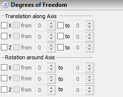 For enabling any of the degrees of freedom, it is necessary to set on the flag to the left of the corresponding string. In this case, the fragment can move along the given axis of the LCS (or rotate around the given axis of the LCS) with no restrictions. For specifying start and/or end limits of permissible motion by allowed degrees of freedom, it is necessary to set on flags before the fields “from” and/or “to” and specify desired value in the opened entry field. Note that for rotation around the LCS axes, two (start and end) limits of motion have to be specified at the same time. For translation along the axis, the limits can be specified independently (for example, only start, or only end limit). |