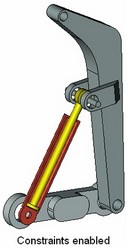 Continuing with the hydraulic cylinder example, let us show how to use the "distance" mate. The mechanism created at the previous step will operate incorrectly in certain motions, because some parts of the hydraulic cylinder may penetrate each other. This problem is resolved by the "distance" mate. One can specify the condition that the distance between the respective faces of the piston and the cylinder must be greater than or equal to zero. When mates are dragged kinematically, this will yield the correct representation of the mechanism's behavior.