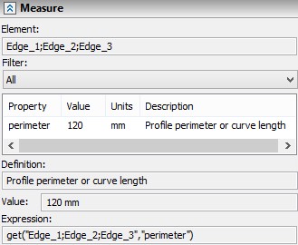 Upon activating this mode and picking the object to be measured, the name of the selected object will be displayed in the "Measure" section of the properties window within the "Element" field, along with its available set of parameters (the table "Property").