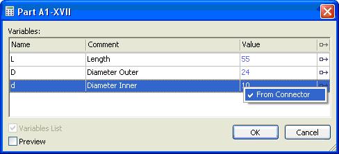 For example, suppose we are building the model of a bearing whose external parameter is the fitting diameter. Let the external variable "D" represent the bearing's diameter. In order to enable this variable to automatically assume a value, a connector value shall be registered for it. The name shall be the same as the one expected to be used in the connector of the shaft to which the bearing is to be fit, for example, this can be the value "Diameter". This is required in order to automatically match the variables of the shaft and the bearing, which may have different names but the same value (the fitting diameter).