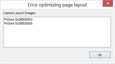 If the size of some image exceeds the size of both existing and automatically created pages of the base document, the dialog window “Error optimizing page Layout” will appear on the screen with the list of problem images. The flag “Change Image Size and Run Optimization Again” found at the bottom of the given dialog allows a user to choose further actions of the system. |