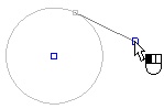 With this option, select a circle or arc (other elements are disallowed from selection), to which the tangency line is to be constructed. The selected element will be highlighted, and the arc will be extended by an auxiliary circle. An auxiliary node will be rubberbanding along the circle. This will be the first node of the line segment, defining the tangency point between the line and the circle. The line will be rubberbanding between the node and the pointer. To complete the tangent line, fix the position of the second node outside the circle.