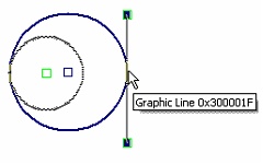 If a graphic line without a parent construction line was selected for snapping, the system will create the construction line automatically. The created construction line becomes the parent of the graphic line. For example, if a graphic circle line was selected, with a certain radius and the center aligned to a node, then the system will create a construction circle with the center at the same node and the same radius. The new construction line becomes the geometrical basis for the graphic circle line. Similarly, a spline graphic line is converted to a graphic line lying on a construction spline going through the same nodes. For a segment with no underlying construction lines, a line is created that is going through the two segment end nodes.