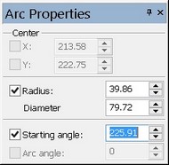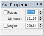 The arc can be arbitrarily input by selecting three points with the mouse, or specified exactly in the property window. In the latter case, the second point is defined in absolute coordinates or by the offsets with respect to the first point of the arc. To define the third point, one can use absolute coordinates, the radius, the diameter or the angular length of the arc in various combinations.