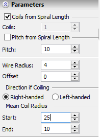 You can define main parameters of the spring in the top section of the property window – "(non-optional) Parameters". Those are wire (strip) radius, the mean radii of the spring and the direction of coiling. To have the spring length calculated by the distance between the axis-defining 3D points, set one of the flags: "Coils from Spiral Length" or "Pitch From Spiral Length". In this case, the system will automatically calculate the value of the parameter with the respective flag set (either the number of coils or the pitch). At the same time, you have to specify a numeric value of the other parameter (either "Coils" or "Pitch"). If none of the flags is set, you will have to specify both the number of coils in the spring and the pitch. The radius of the spring strip (wire) is specified in the box "Wire Radius". The winding direction of the spring is controlled by the radio group "Direction of Coiling". The start and end mean radii of the spring are defined by the parameters "Mean Coil Diameter/Start" and "Mean Coil Diameter/End". To create a cylindrical spring, specify equal values for both radii. |