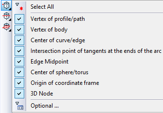 You can select any 3D elements as the object, that define a point, line or plane. Any of those options contains a list of filters for selecting 3D elements, that tune the selector for picking the desired geometry type. Use of those filters is described in details in the chapter "Basic 3D terms and principles of modeling with T-FLEX CAD 3D". To select a different object for defining the position of the thread boundary, simply repeat the selection. You can cancel relations between thread boundaries and selected objects by modifying the thread offset option in the automenu or in the property window.