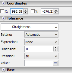 The dialog in the command’s properties window contains all main parameters of the tolerance. To make the work with this dialog more convenient the dialog is divided into several sections.