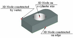3D node is one of the basic construction entities used for representing a point in the three-dimensional space. There are several ways of creating 3D nodes. A 3D node can be specified, for instance, as a characteristic point on a body, referencing a vertex, an edge, or a face. It also can be located by using absolute coordinates or offsets from other 3D nodes. 3D nodes can also be specified using the nodes from the two-dimensional drawing, and workplanes. In this way, the 3D node will be defined by selecting one node on a workplane, or two nodes on two different workplanes that are related by having a common projection. |