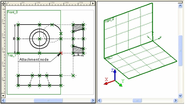 The correct definition of the displayed borders of the workplane helps simplify the future creation of 3D constructions on the plane from the 2D drawing. When selecting 2D elements to use for 3D constructions, you need to define, in which workplane those elements belong. The system can do it automatically by taking the plane, whose border rectangle covers the selected 2D elements. If the borders of the planes on the 2D page do not align with the respective drawing views, the system choice will be incorrect, and you will have to select the workplane manually. Therefore, the attachment node should be selected in such a way, that the workplane border rectangle agreed with the drawing view intended for the plane. If this cannot be achieved by selecting the attachment node, the border size and position of the workplane being created can be additionally adjusted, as described in the next paragraph.