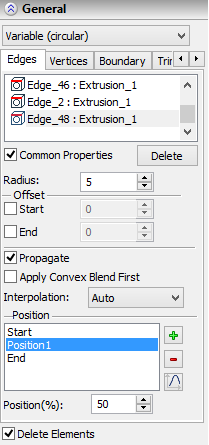 2. Select the type "Variable (circular)" in the pull-down menu of the property window. The necessary controls will appear for defining the rest of parameters. 3. Next, the set of intermediate points needs to be defined, and radii specified in each point. Important: initially, the system tries to compose one chain (not necessarily smooth) of all selected edges. If this is impossible, then several chains will be composed. Within each edge chain, the set of points is distributed along the full length of the chain. The system can automatically compose the chains from the edges marked with the flag "Common Properties". If the flag "Common Properties" is off for some edge then the whole set of points will be distributed along this edge only, and stay strictly specific to this edge. If several edges are processed simultaneously that make a smooth chain, while the "Common Properties" flag is off, make sure the radii on each side of the edge joints are equal. |