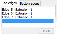 Each selected edge will be added to the list of edges in the properties window. Switching between selecting the top and bottom sets of edges can be done either by the automenu options or by clicking the respective tabs in the properties window dialog. To remove an edge from the list, select it in the list, and then press the [Delete] button or <Del> key. |
