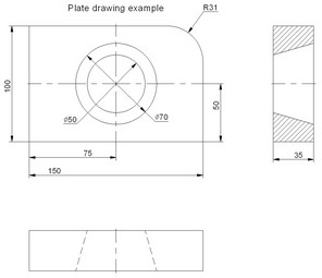 The variables r_min and r_max define the radii of the conic-shape hole; flag_1 defines the visibility level of the axes; flag_3, size and $text define, respectively, the visibility level, the font size and the drawing title text; flag_21 and flag_22 define, respectively, the visibility levels of the linear dimensions and the circle-referencing dimensions. Their values are driven by the variable dim_mode that controls the type of the displayed dimensions (none, linear only, circle dimensions only or all dimensions).