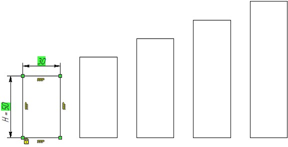 Let's review the process of creating a dialog box using the example. The files for the examples described in the present chapter are located in the library “Examples” in the folder “\T-FLEX Parametric CAD 15 \Libraries\Examples\Parametrization\Control”. The drawing being considered is stored in the file “Sample plate drawing.GRB”. To modify parameters of the drawing, let's introduce a set of variables: The variables height, width and width_1 are used as parameters of the lines defining the part dimensions;