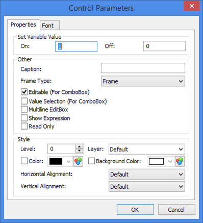 Frame: Frame Type: frame or rectangle. Edit Box: Multiline EditBox – used for text variables only. Permits entering multiple lines. Show Expression. This parameter affects custom dialogs when using variables. Usually, names of the variables are not displayed in the dialog boxes, when such variables or expressions are used as parameters of the fragments being inserted into assemblies. This option outputs name of a variable in edit fields of the dialog boxes. At the same time variable’s value or expression is displayed nearby. Read Only. When this flag is turned on, the editor will work in a regime “read only”, i.e., in the Edit Box field the value of the connected to this field variable will be shown but this value will not be possible to modify. Combo Box: Editable – allows direct input of variable values without selecting from the list. Value Selection. Option is used for binding external variables between each other. For example to select the thread pitch from list, according to the thread diameter, automatically. If the option is not activated, the thread pitch will not change according to diameter.