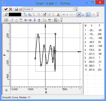 At the right of the workspace there is the table of graph point coordinates. Point coordinates can be edited directly in this table. You can start editing coordinates after double-clicking Левый клик ТекстЛевый клик Текст in the desired table cell. To input changes, press <Enter> or switch the input focus to another window. The edited (selected) graph point is highlighted. To select several points, use the keys <Shift> or <Ctrl>.
