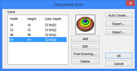 There is one more button in the command dialog which allows a user to create icons – button [Auto Create…]. This button creates all four icons at once (of size 16x16, 32x32, 48x48, 64x64 pixels). The icon image is specified in the same way as when using the button [From Drawing…].