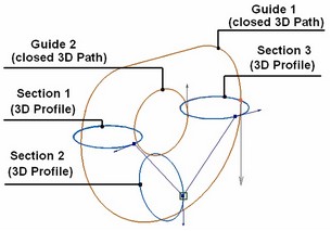 Instead of guides, one 3D path can be used, as if replacing multiple guides passing through all section points. The path defines the boundary conditions for t and he entire resulting surface. Therefore, other boundary conditions are not subject to being defined when the guide is defined. The only exception is the option of specifying the tangent direction with respect to the surface being created as derived from the path at the point where it intersects the section defined by the 3D profile (see below). A path is not required to intersect with the sections. The diagrams following below demonstrate the operation created with neither a path nor guides (left) and the one using a 3D path (right).