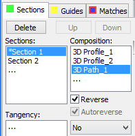 To switch to the guide definition mode, go to the [Guides] tab of the property window. Just like the Sections tab, this one hosts three panes, "Guides", "Composition" and "Tangency". The latter will be used when defining boundary conditions (see below). If an error occurs while composing the contour, then the guide is marked by "*". To select a new guide, click at the new line of the "Guides" pane. The new line is marked by an ellipsis. Upon switching to the tab, the automenu enters the mode of guide selection. The necessary options become available.