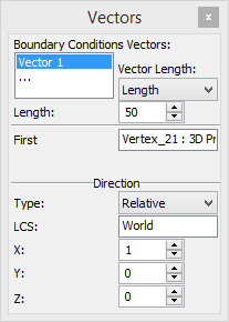 Upon specifying the start point, additional parameters become accessible in the Vectors dialog box for defining the vector direction. The direction of the vector can be defined in one of the following ways: