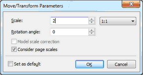 The dialog of parameters of the already created 2D copy (by translation, rotation, scaling – except symmetry) contains two additional flags: “Correction for a scale of model” and “Compensate scales of pages”. These flags are taken into account when copying between pages is performed. The “Correction for a scale of model” flag is available only for translations created automatically upon construction of taken out elements. |