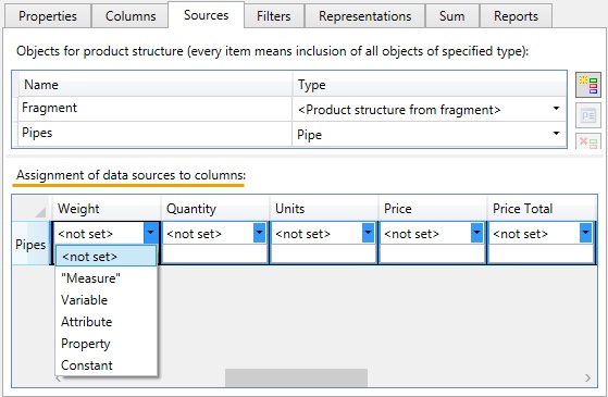 You can set data that will be set to column data cells of product structure for each data source. Assignment of data sources to columns section is used for this purpose.
