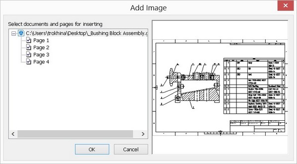 When among the selected documents there is at least one multi-page document, the dialog window “Add Image” is opened additionally. The list of the selected documents together with the specified pages of the given documents as well as the area for the preview of the pages contents are displayed in this window.