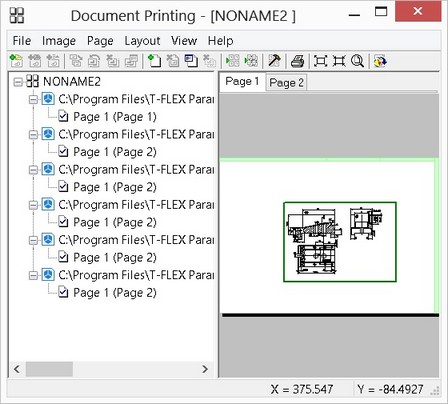 The batch of documents will be composed on the basis of the document opened in the active window of the T-FLEX CAD upon invoking the print module. The pages of the base document correspond to the print paper sheets. The images of the documents which need to be printed out are placed on these paper sheets. When carrying out the batch layout for printing, new pages can be automatically added to the base document, and also the settings of already existing pages can be modified. Thus, before calling the print module, it is recommended to create a new blank drafting which will become the basis for compiling the batch of documents.