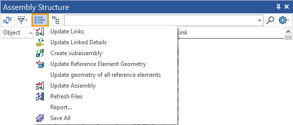 You can update reference elements from the "Assembly Structure" window of an assembly, or from a subassembly, and only the reference elements that are included in that subassembly will be updated. You can update the reference elements of all the fragments in the assembly (subassembly).