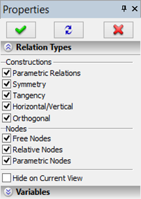 The flags in an additional "Variables" section serve to control the visibility of Relations depending on whether variables were used to define geometrical parameters of those elements (by default, those flags are disabled):